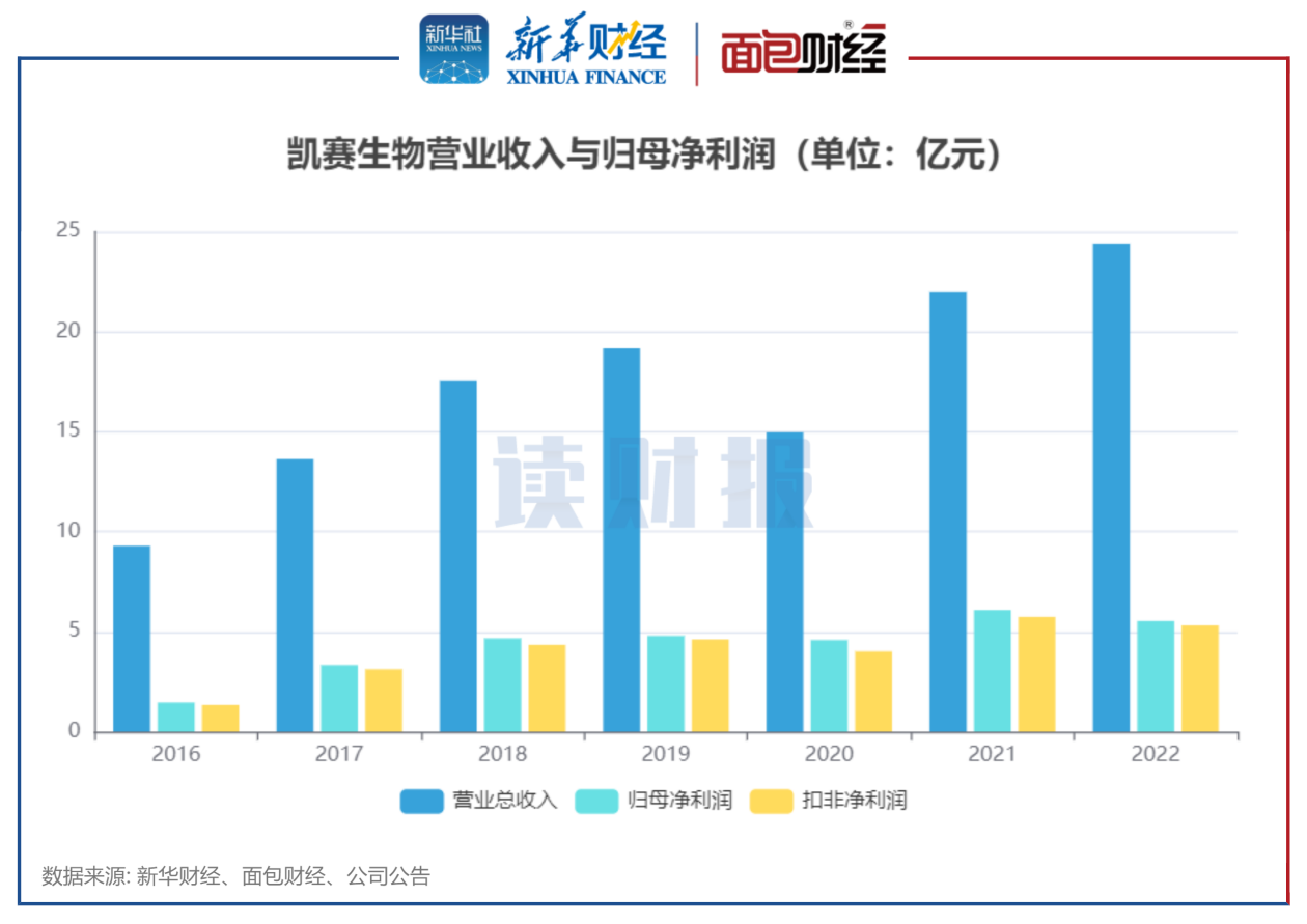 分析发现,凯赛生物业绩及盈利正承压。2022年,凯赛生物的增长压力便有所显现,当年营收为24.41亿元,同比微增3.28%;归母净利润5.53亿元,同比下降6.97%。
