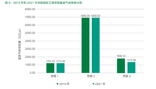 报告将2019年设为基准年,并选取近三年中运营活动数据较为正常的2021年作为跟踪评估年,全面评估和掌握学院温室气体排放情况。数据表明,2019年中欧五大校区温室气体排放总量为9977.29tCO2e,2021年温室气体排放总量为9515.13tCO2e。相较于2019年,2021年中欧温室气体排放总量下降4.63%。