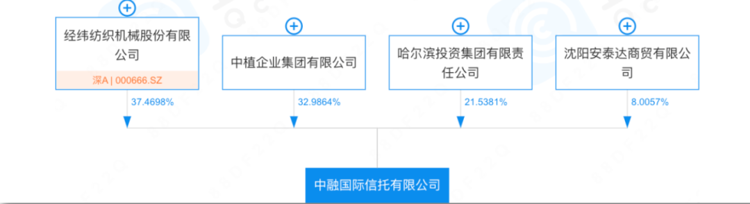 据披露,经纬纺机为中融信托第一大股东,持股比例约为37.469%,中植企业集团有限公司则持有中融信托32.986%股份。