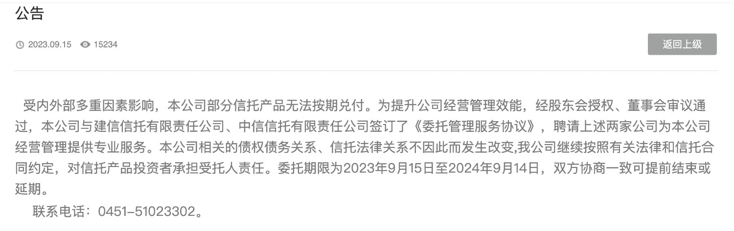 中融信托公告称:“受内外部多重因素影响,本公司部分信托产品无法按期兑付。为提升公司经营管理效能,经股东会授权、董事会审议通过,本公司与建信信托、中信信托签订了《委托管理服务协议》,聘请上述两家公司为本公司经营管理提供专业服务。”