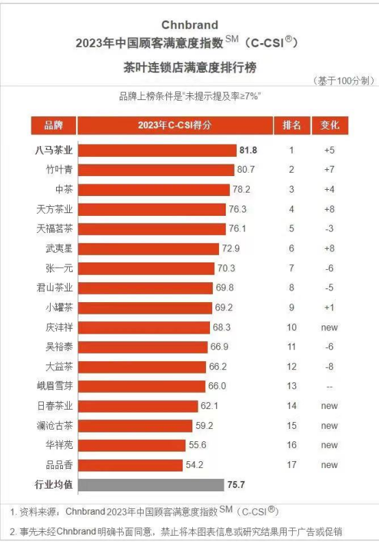 八马茶业在Chnbrand 2023中国顾客满意度指数茶叶连锁店满意度榜单中位列第一