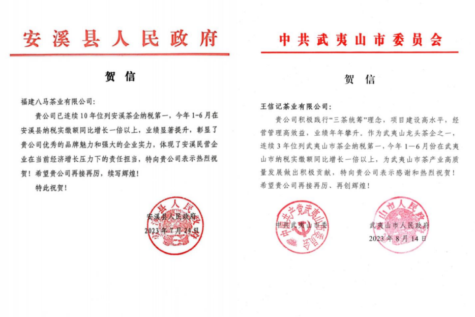 据安溪县人民政府、武夷山市委市政府贺信显示,八马茶业2023年上半年在两地纳税额均同比增长超100%。