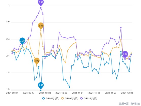 7日,银行间质押式回购市场隔夜-14D品种全线上涨,其中隔夜品种涨幅最大、7D次之、14D品种相对稳定。具体来看,DR001加权平均利率报2.1302%,较前一交易日涨31.47BP;DR007报2.1519%,涨6.31BP;DR014报2.1188%,涨8.03BP。R001加权平均利率报2.4060%,较前一交易日涨54.31BP;R007报2.3680%,涨18.09BP;R014报2.3660%,涨0.55BP。