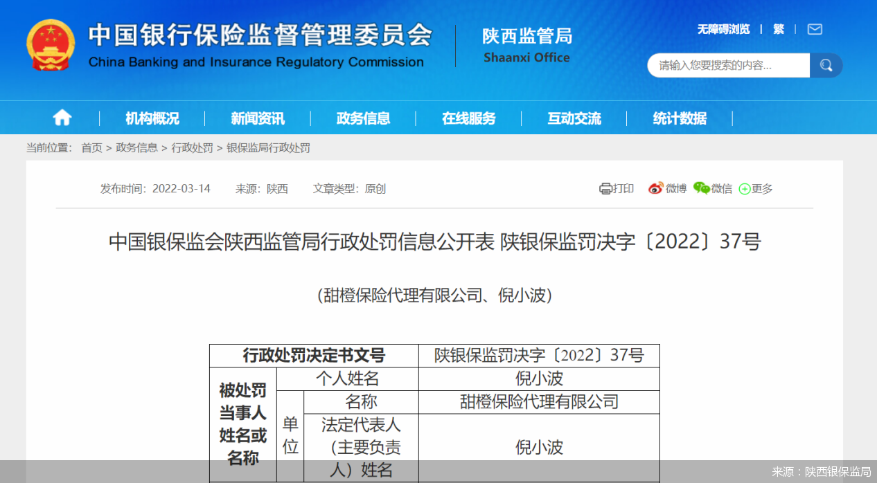 3月14日,据陕西银保监局披露,甜橙保险因与非法从事保险中介业务的机构发生保险代理业务往来、违反规定开展互联网保险业务,被责令改正,予以警告,并处3.5万元罚款,甜橙保险时任法定代表人倪小波被警告并处1.2万元罚款。