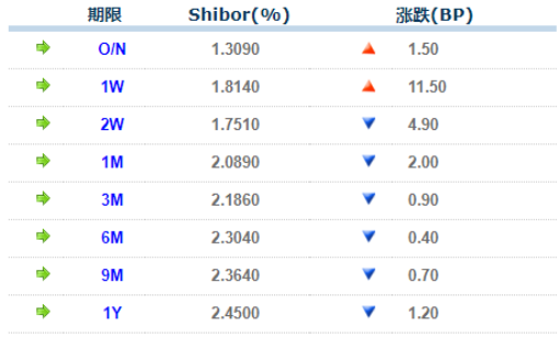 9日上海银行间同业拆放利率(Shibor)涨跌互现,幅度可控。其中,隔夜Shibor涨1.50BP,报1.3090%;7天Shibor涨11.50BP,报1.8140%;14天Shibor跌4.90BP,报1.7510%。