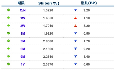 20日,上海银行间同业拆放利率(Shibor)隔夜品种跌幅扩大,其余品种变化不大。具体看,隔夜Shibor跌9.20BP,报1.3220%;7天Shibor涨1.10BP,报1.6650%;14天Shibor涨3.20BP,报1.7010%。