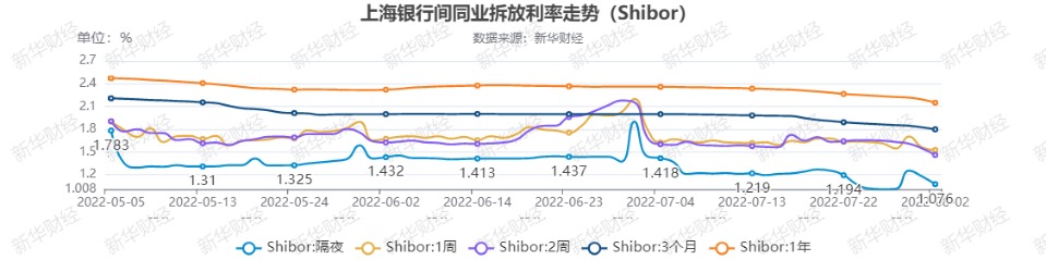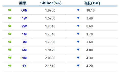 受资金面变化影响,2日上海银行间同业拆放利率(Shibor)继续全线走低。其中隔夜Shibor跌10.1BP,报1.0760%;7天Shibor跌3.4个基点,报1.5260%;14天Shibor跌8.60BP,报1.4610%。