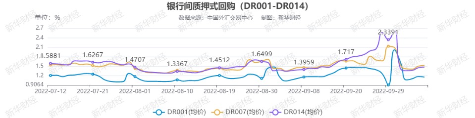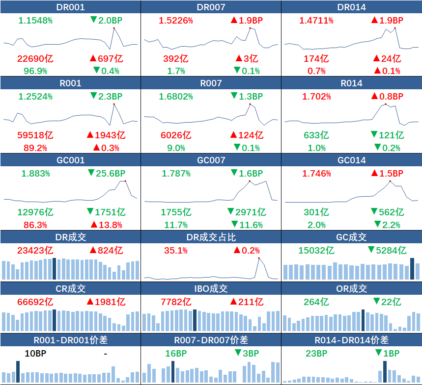 银行间质押式回购市场方面,隔夜-14D资金利率窄幅震荡。具体看,DR001、R001加权平均利率分别较前一交易日下行2BP、2.3BP,报1.1548%、1.2524%;成交额分别增加697亿元、1943亿元。DR007、R007加权平均利率分别上行1.9BP、下行1.3BP,报1.5226%、1.6802%;成交额分别增加3亿元、124亿元。DR014、R014加权平均利率分别上行1.9BP、0.8BP,报1.4711%、1.702%;成交额分别增加24亿元、减少121亿元。