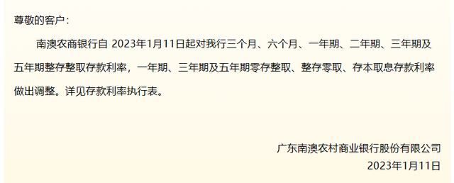1月11日,广东南澳农商银行发布了一则关于调整存款利率的公告,这是继去年9月之后该行又一次调整存款利率。
