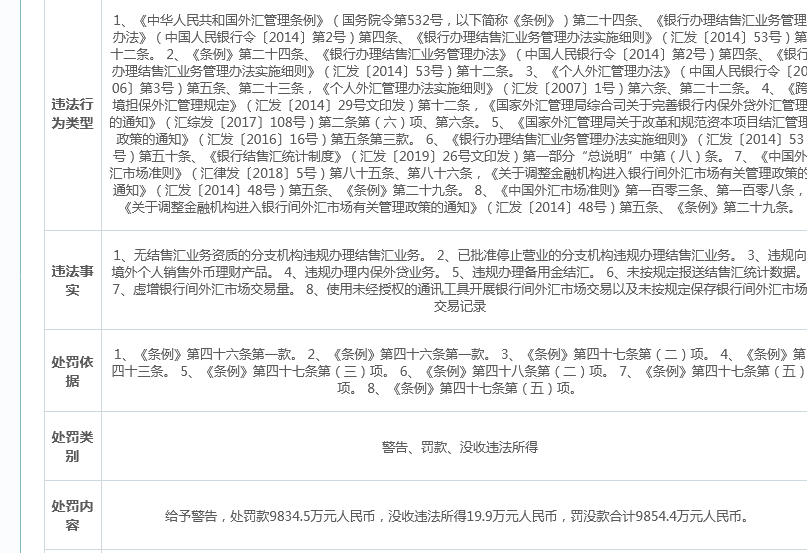 4月28日,国家外汇管理局上海市分局对上海银行开出行政处罚决定书,对该行在结售汇、外币理财、内保外贷、外汇市场交易领域的部分违法违规行为给予警告,处罚款9834.5万元人民币,没收违法所得19.9万元人民币,罚没款合计9854.4万元人民币。同时,该行三名相关责任人被给予警告及罚款。