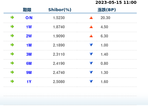 5月15日隔夜Shibor涨20.30BP,报1.5230%;7天Shibor涨4.50BP,报1.8740%;14天Shibor涨6.30BP,报1.9090%。