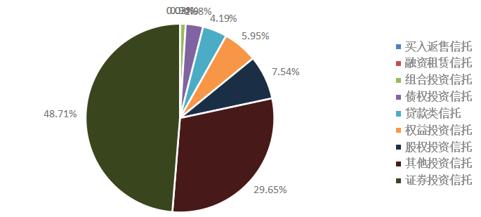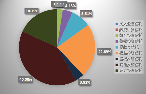 按照规模来看,其他投资信托占比最多,为40%;权益投资信托次之,占比22.89%;证券投资信托占比18.19%,贷款类信托占比8.51%,债权投资信托占比4.18%,股权投资信托占比3.82%,组合投资信托占比2.30%,买入返售信托和融资租赁信托分别占比0.09%、0.02%。