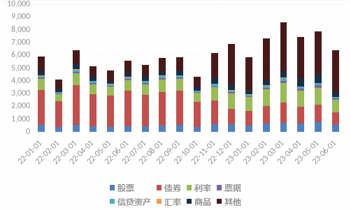 按照比例来,1-6月新发理财产品中,债券类占比18.04%,同比减少30.97pct;利率类占比17.22%,相较于2022年同期增加2.64pct;股票类占比8.64%,相较于2022年同期增加0.06pct;商品类占比7.05%,同比增加0.95pct;信贷资产类占比2.26%,较2022年同期减少0.15pct;票据平均占比1.93%,同比增加0.39pct。