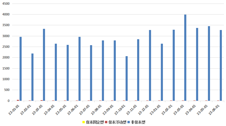 2023年1-6月,银行理财产品累计发行数量为20047只,较2022年同期增加3236只,同比增长19.25%;非保本理财发行占比99.87%,保本理财发行仅有26只。单月来看,一季度发行数量维持递增态势,3月份发行数量最多,发行数量达3991只;二季度发行数量维持平稳,4-6月单月发行数量相对均衡,6月份较4、5月份小幅回落。