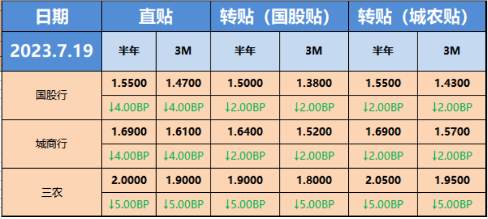 转贴市场方面,国股贴半年国股行报1.5000,下跌2.00BP;国股贴3M国股行报1.3800,下跌2.00BP。国股贴半年城商行报1.6400,下跌2.00BP;国股贴3M城商行报1.5200,下跌2.00BP。国股贴半年三农报1.9000,下跌5.00BP;国股贴3M三农报1.8000,下跌5.00BP。城农贴半年国股行报1.5500,下跌2.00BP;城农贴3M国股行报1.4300,下跌2.00BP。城农贴半年城商行报1.6900,下跌2.00BP;城农贴3M城商行报1.5700,下跌2.00BP;城农贴半年三农报2.0500,下跌5.00BP;城农贴3M三农报1.9500,下跌5.00BP。