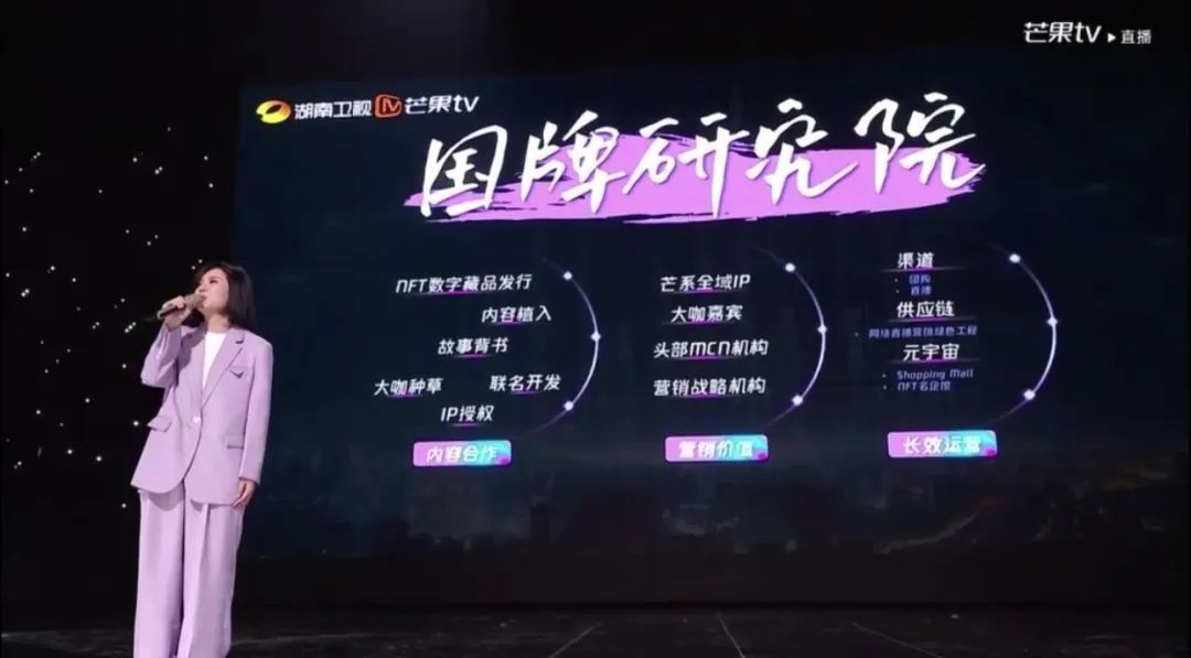 《国牌研究院》横向资源以芒果TV&湖南卫视广告资源助推国家自主品牌的知名度及影响力,并以芒果全域IP拉通全年品牌战略合作,在芒果全域铺量提升认知。纵向资源以“好品中国”行动计划为行业构建好企业、好产品、好品牌、好渠道、好买家的生态闭环系统。同时,在品牌营销层面联动所有嘉宾和机构,在国货种草传播扩散、品牌洞察及创意输出、节目外花式直播种草等方面强势助推国货品牌。在内容营销层面加大内容植入、故事背书等,还可以通过IP授权、联名开发、NFT数字藏品发行等形式去创新品牌升级,并长效助力品牌持续运营,成为“国牌行动计划”及芒系生态的长期生意共赢伙伴。