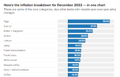 劳工部数据显示,2022年12月,与民众生活息息相关的多种商品价格同比涨幅惊人。其中,中小学营养餐价格上涨305%,鸡蛋价格上涨59.9%,人造黄油价格上涨43.8%,燃油价格上涨41.5%,机票价格上涨28.5%,烘焙咖啡价格上涨15.5%,奶制品价格上涨15.3%。