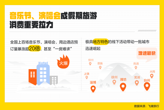 据了解,3月至今飞猪上线了多款包含演唱会、音乐节门票以及酒店入住权益的“旅行+音乐”商品,备受年轻消费者青睐。音乐之外,“旅行+看展”“旅行+电竞”“旅行+刷博物馆”也是年轻人的心头好,旅游在周边消费场景上的溢出效应愈发明显。飞猪数据显示,北京、上海、杭州、成都、西安、广州、重庆、武汉、长沙、南京等是“五一”热门目的地。此外,淄博、潍坊、徐州、南通、大同、上饶、柳州、台州、芜湖、恩施等城市的“五一”假期旅游商品预订量增速最快。