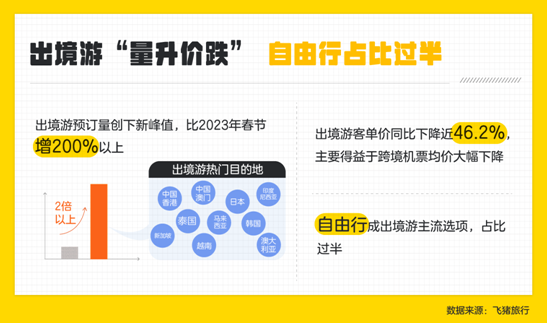 出境游方面,整体来看,出境游需求在“五一”加速释放,并呈现出“量升价跌”趋势。飞猪的“五一”出境游预订量创下新峰值,相较2023年春节假期又增长200%以上。中国香港、泰国、日本、马来西亚、韩国、中国澳门、新加坡、越南、印度尼西亚、澳大利亚等是热门目的地,埃及、阿联酋、意大利、越南、法国等也迎来快速增长。值得一提的是,得益于跨境机票价格持续下降,出境游客单价同比去年下降46.2%。