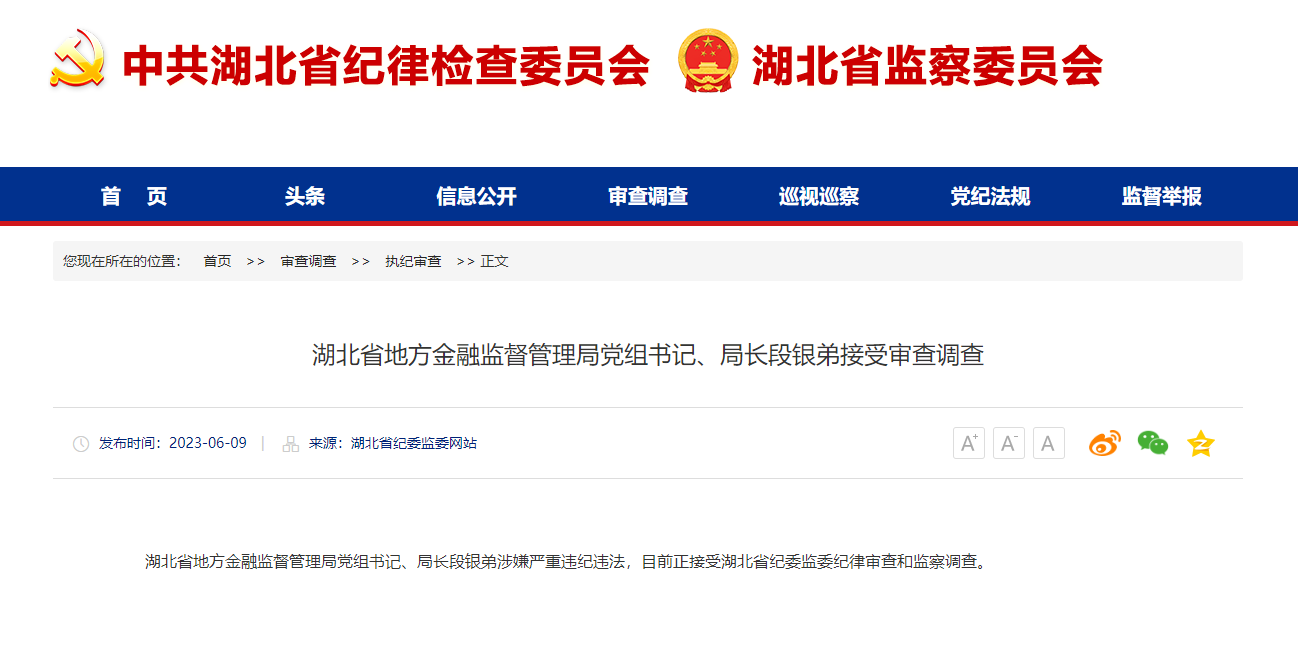 湖北省地方金融监督管理局局长段银弟接受审查调查
