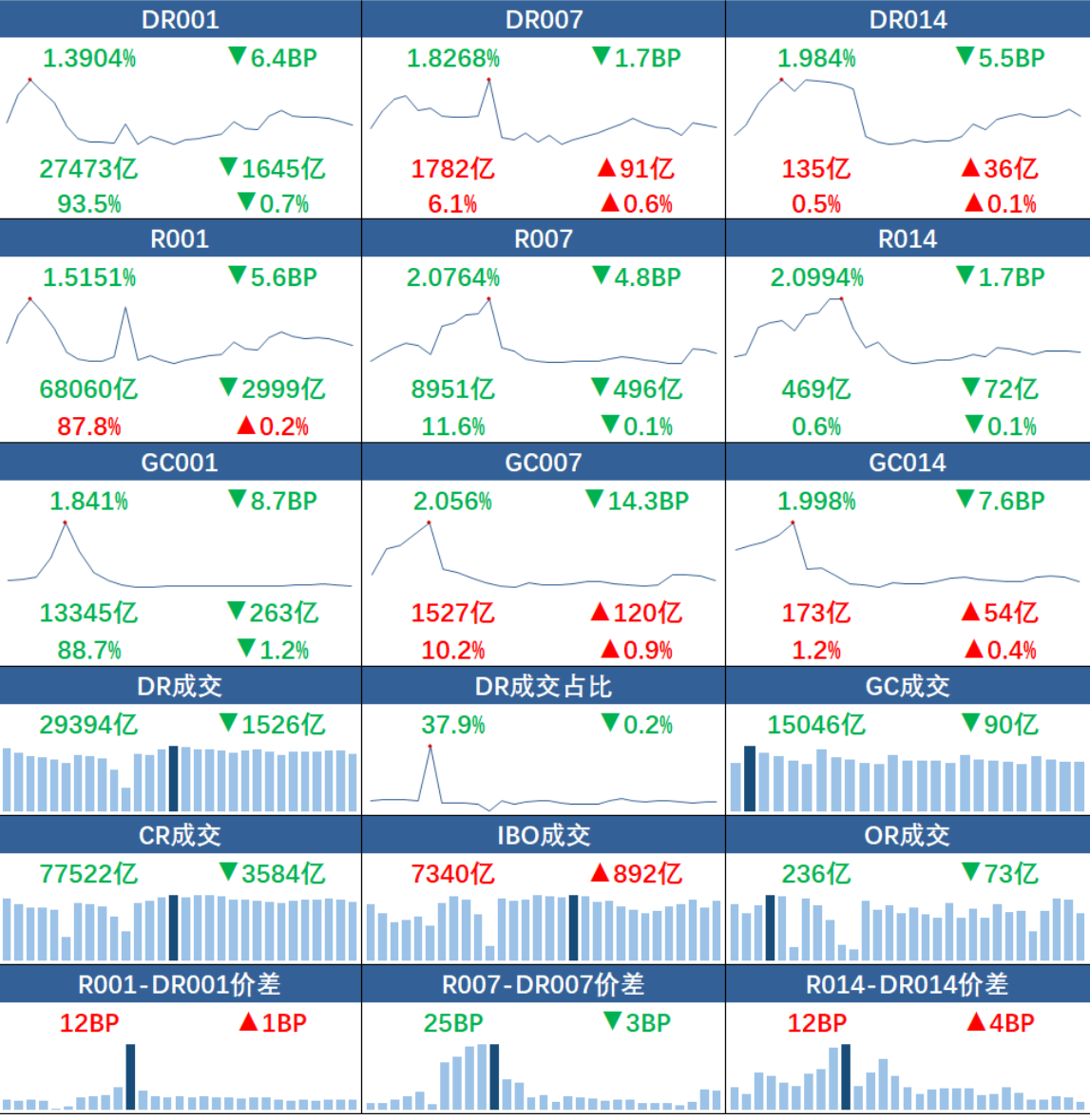 银行间质押式回购市场方面,多数品种量价齐跌。具体看,DR001、R001加权平均利率分别下行6.4BP、5.6BP,报1.3904%、1.5151%,成交额分别减少1645亿元、2999亿元;DR007、R007加权平均利率分别下行1.7BP、4.8BP,报1.8268%、2.0764%,成交额分别增加91亿元、减少496亿元;DR014、R014加权平均利率分别下行5.5BP、1.7BP,报1.984%、2.0994%,成交额分别增加36亿元、减少72亿元。