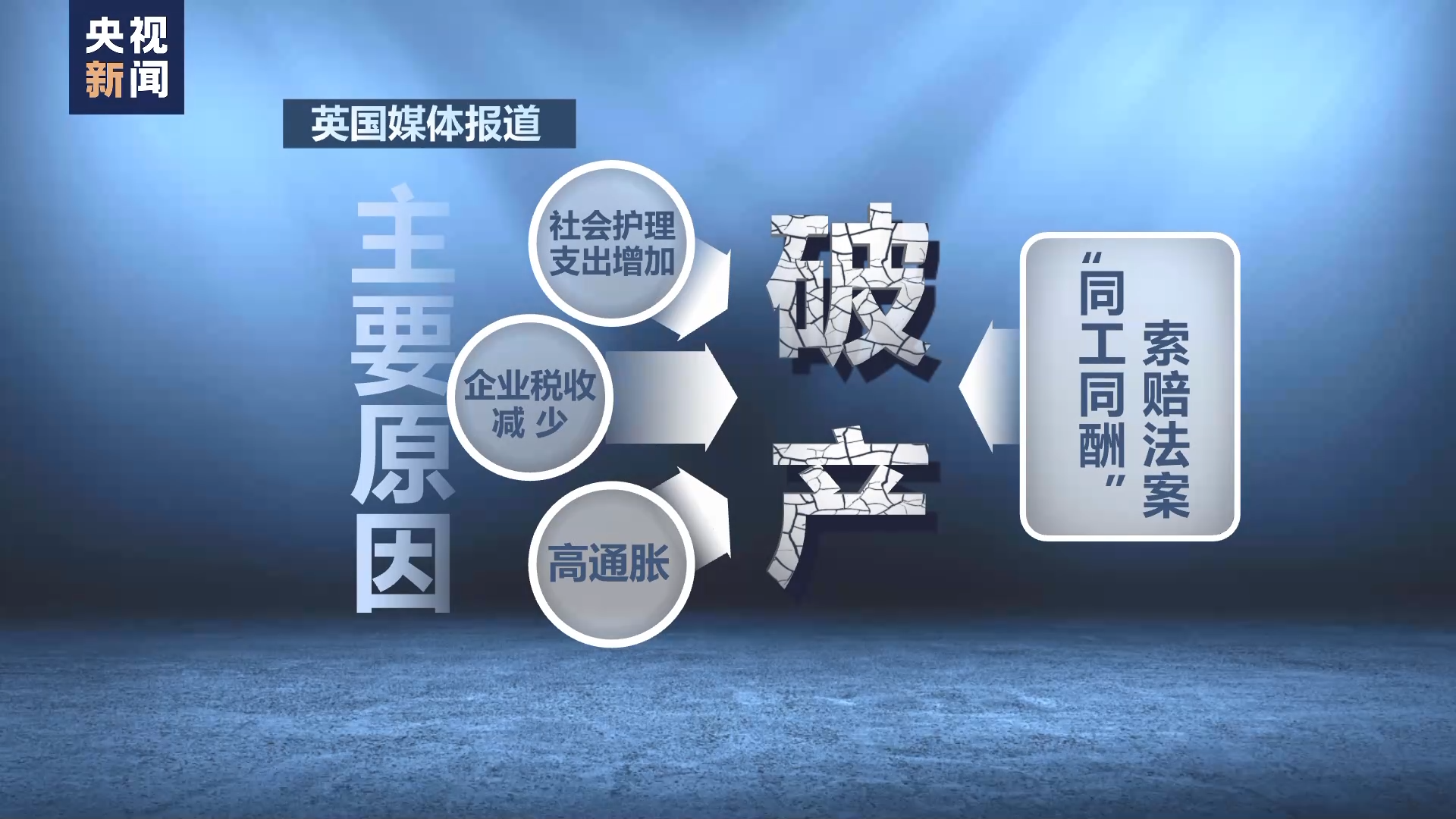 英国媒体给出了四个理由,据英国媒体报道,破产的主要原因是社会护理支出增加、企业税收减少和高通胀。此外还与解决同工同酬索赔的数亿英镑法案有关。