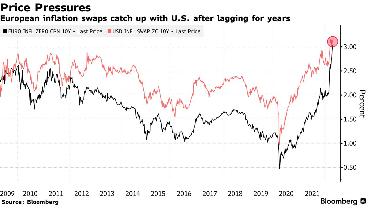与欧元区消费者物价调和指数(HICP)相关的掉期交易显示,未来十年欧元的通胀率约为3.1%,而美国为3.2%。