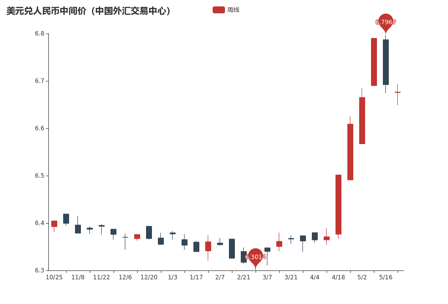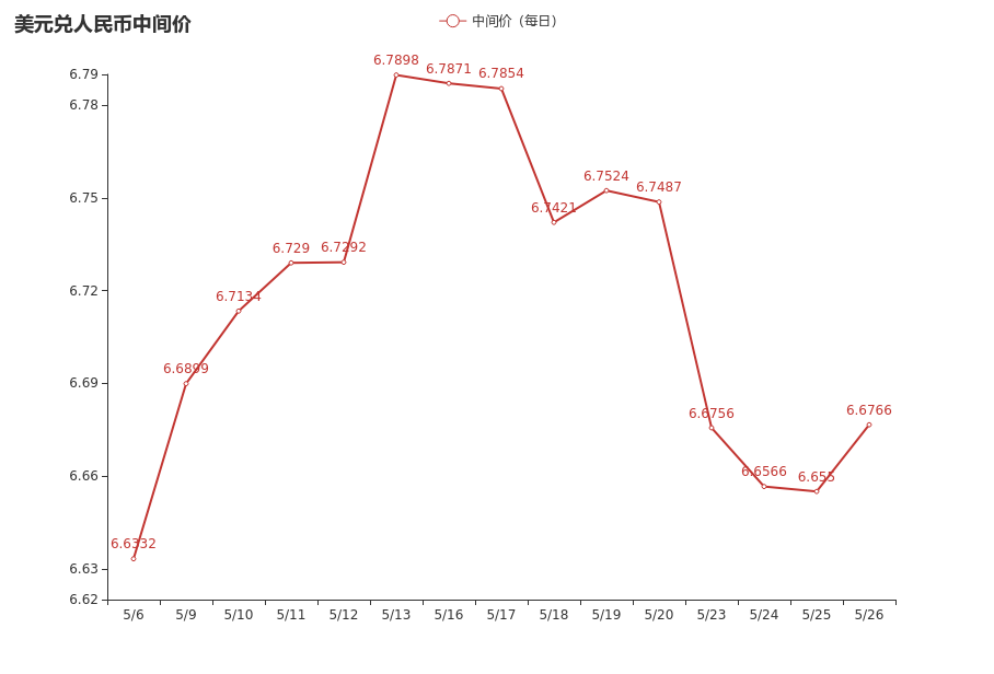 5月26日,人民币中间价下调216个基点。美元兑人民币中间价报6.6766元,上一交易日中间价报6.6550元,官方收盘价报6.6737元,夜盘收盘价报6.6940元。