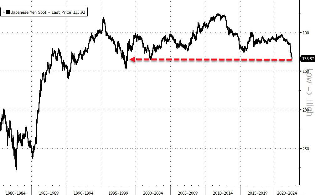 今年以来,日元加速贬值,目前已经处于24年来的低位。
