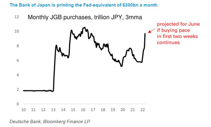 德意志银行的分析师George Saravelos在6月13日周一上午发表的一篇题为《印钞机正在超速运转》的研究报告中称,日本央行在6月份的购债规模将达到大约10万亿日元。这一规模如果放在美国来看,相当于美联储每月购债3000亿美元实行量化宽松。