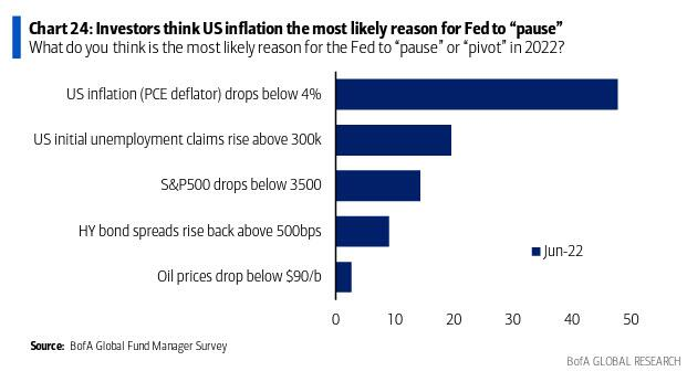 也就是说,一旦美联储开始降息,降息的速度会更快,而且幅度更大。但美联储是否会在经济衰退中停止加息呢?美银美林的基金调查(Fund Manager Survey)显示,美联储在2022年暂停或转向有5个潜在原因。