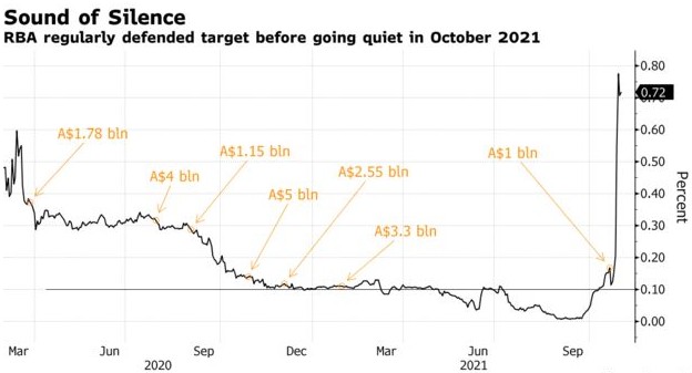 2021年11月,澳储行今日早些时候宣布放弃其债券收益目标,即取消2024年4月到期债券0.1%的国债收益率目标。有财经媒体认为,这在一定程度上表明澳联储、日本央行和其他各大央行在市场动能增强时维持收益率目标的难度激增。当时主要经济体通胀压力加剧,引发全球债券崩盘。澳储行洛威在当时的一份声明中承认,他实际上是在向市场力量低头。