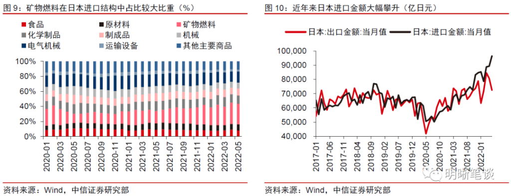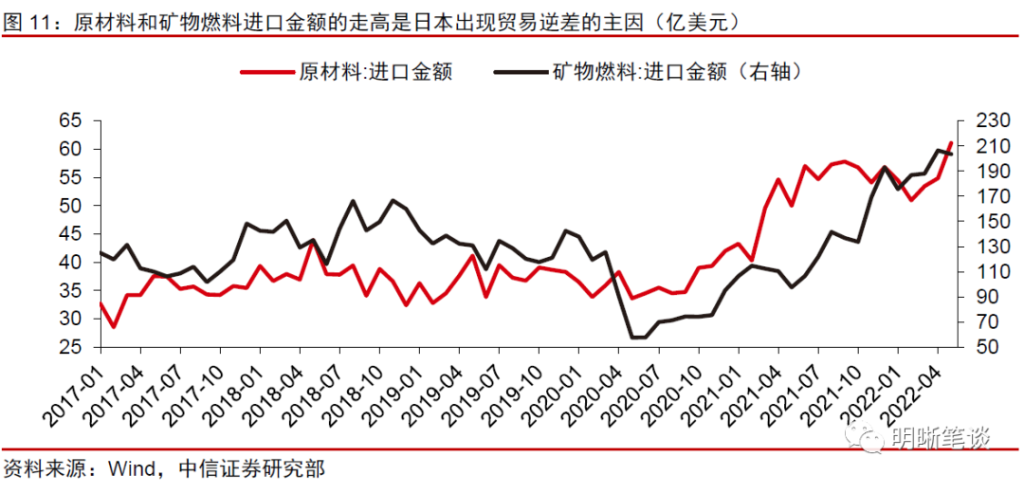 以日本为例,矿物燃料在其进口结构中占据较大比重。2020年疫情爆发之后,相关产品进口金额的大幅走高是日本出现贸易逆差的主因,叠加美日两国在经济基本面和货币政策的分化,日元出现快速贬值。从日本的进口结构来看,日本主要的进口商品为矿物燃料,包括石油、天然气和煤炭,此外以有色金属和铁矿石为代表的原材料也占据一定比例。2017年-2019年期间,日本每月进口原材料和矿物燃料的金额占其当月总进口的平均比例分别为6.15%和21.96%。而在2021年6月之后,这一比例分别上行至7.5%和26.23%。2021年下半年以来,大宗商品进口金额的攀升或是同期日本贸易总额出现逆差的主要原因之一,进而导致经常项目对于日元的支撑削弱。随着美联储开启加息,而日央行仍然实行宽松的货币政策,日元快速贬值,美元兑日元即期汇率从2021年1月4日的103.14升至2022年7月8日的136.09。