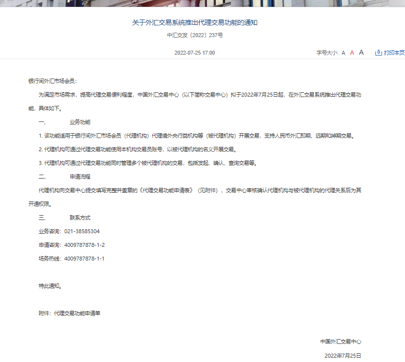 中国外汇交易中心发布关于外汇交易系统推出代理交易功能的通知显示,中国外汇交易中心拟于2022年7月25日起,在外汇交易系统推出代理交易功能。