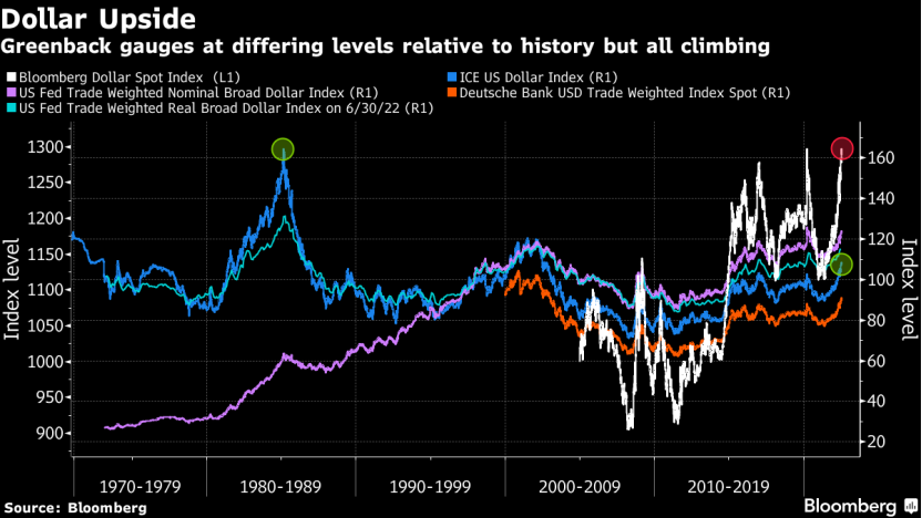 从2004年底才开始有数据纪录的彭博美元现货指数本月创下新高。而ICE美元指数显示,现在美元价格仍远低于1980年代的水平,它需要再上涨54%才能回到签订广场协议那一年的最高点。