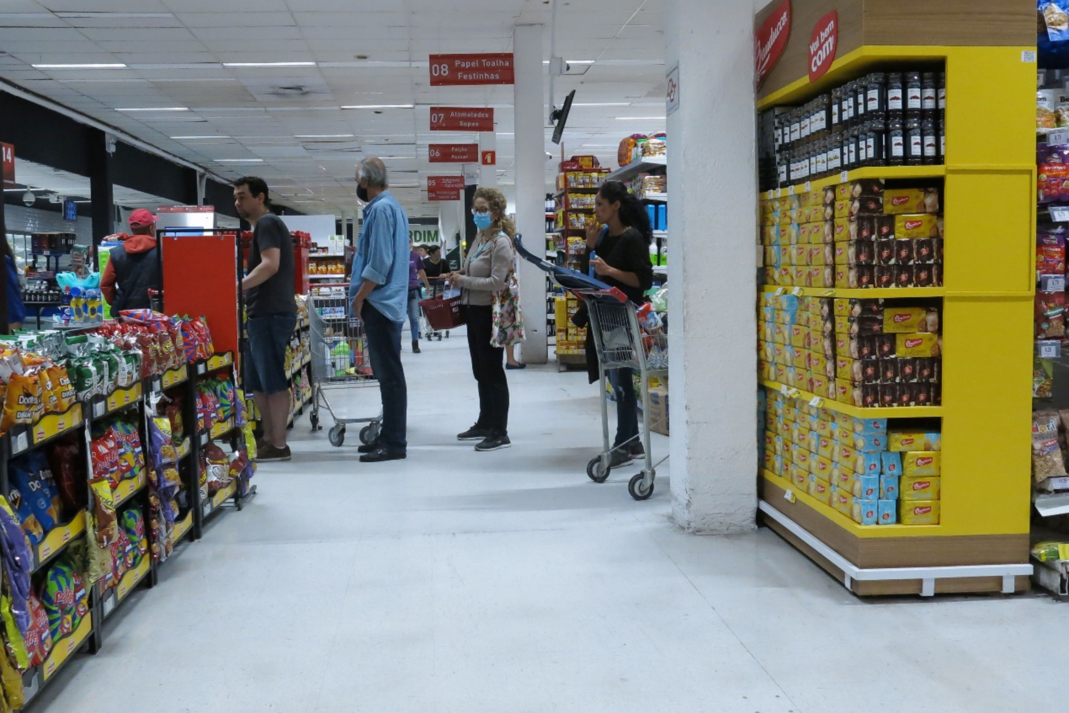 图为2022年7月,巴西圣保罗市一家超市内消费者在排队结账