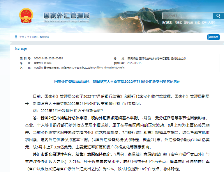 【金融街发布】国家外汇管理局:7月份外汇市场交易理性有序 结售汇意愿保持稳定