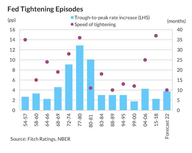 不过,他指出美联储意识到通胀根深蒂固、深入系统的风险真实存在,决心采取激进措施避免上述情况的发生。惠誉预计,今年末美国通胀率将维持在7%的高位,而美联储将于年底时加息至4%,并维持该利率水平直至2024年初。这就意味着,本轮加息周期从利率低点到利率峰值仅历时10个月,有望成为美国历史上最快紧缩周期,而历史经验表明,急剧的货币紧缩往往是美国经济衰退的前奏。