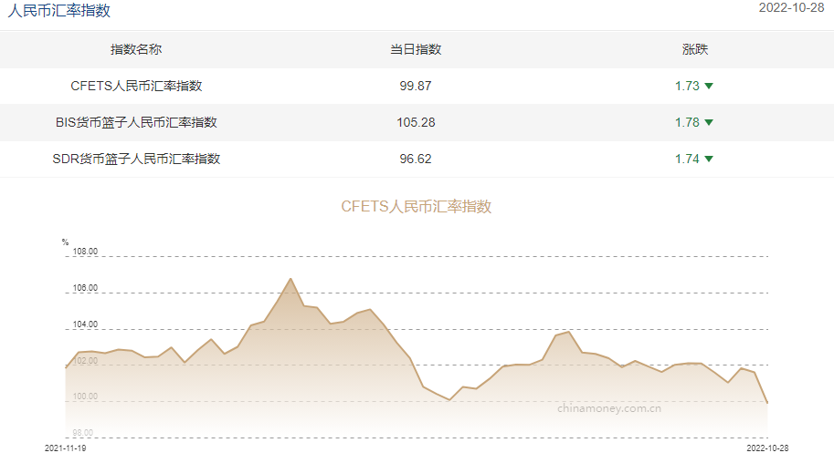2022年10月28日CFETS人民币汇率指数为99.87,按周跌1.73%;BIS货币篮子人民币汇率指数报105.28,按周跌1.78%;SDR货币篮子人民币汇率指数报96.62,按周跌1.74%。