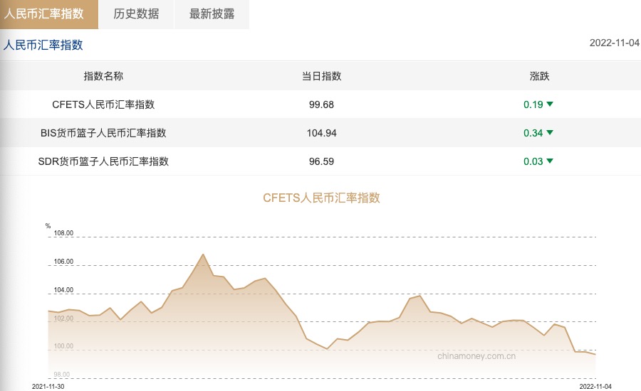 2022年11月4日CFETS人民币汇率指数为99.68,按周跌0.19%;BIS货币篮子人民币汇率指数报104.94,按周跌0.34%;SDR货币篮子人民币汇率指数报96.59,按周跌0.03%。
