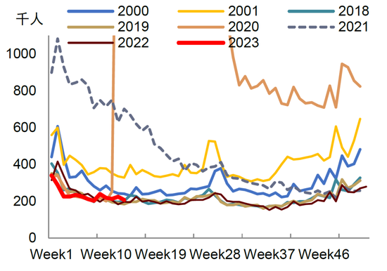 图表:周度首次申请失业金人数已超过疫情前同期