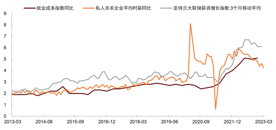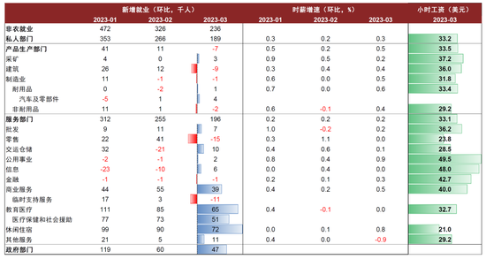 ►美国3月非农数据仍然稳健,新增就业边际上也有降温迹象。3月新增非农就业23.6万人,较上月的32.6万下滑,其中教育医疗(+6.5万人)、休闲住宿(+7.2万人)和政府部门(+4.7万人)就业增长较多,而疫情前期招聘较多的零售(-1.5万人)、临时支持服务(-1.1万人)以及建筑(-9千人)、制造(-1千人)行业的新增就业有所下降。虽然3月新增非农已是今年以来连续第三月下降,但超过20万的新增就业也仍高于疫情前水平。3月失业率再度下降至3.5%这一历史低位,劳动参与率小幅上升至62.6%,显示劳动力供给有所恢复。供给修复叠加需求趋缓,非农小时工资同比增速回落至4.2%(前值4.6%),工资通胀压力有所减弱。