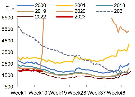►这是否意味着未来失业率也不会上升呢?历史表明失业率一般取决于两个因素,一是企业裁员的幅度,二是失业者再就业的难度。随着经济放缓,自去年底以来美国许多科技业、金融业大公司纷纷宣布裁员,从最新的周度失业金申领数据来看,初次申领失业金人数已超过2018、2019年同期,持续申领失业金的人数也接近疫情前同期的水平,显示企业裁员的影响在逐步显现。另一方面,如上所述,我们认为经济放缓导致企业招聘需求放缓,失业者再就业的难度也将逐步上升。由此来看,未来失业率仍可能上升,只是由于劳动力供给下降,失业率上升的速度可能会比以往经济周期更慢一些。