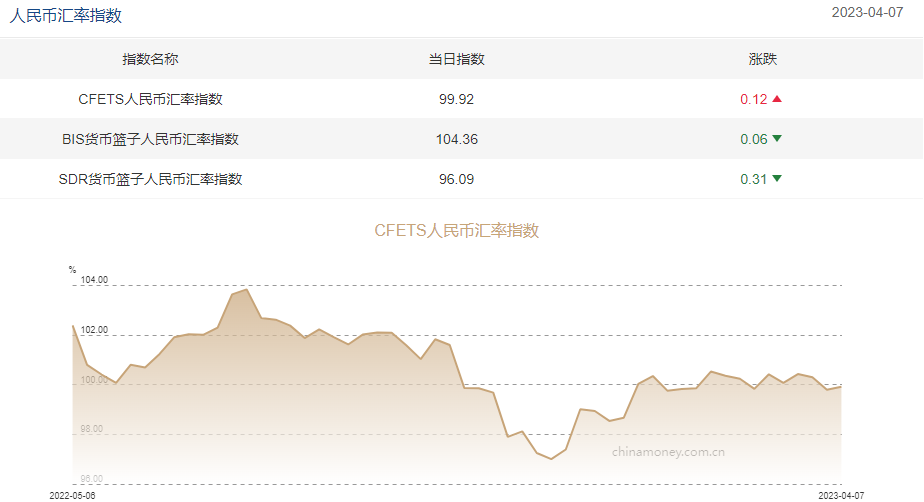 2023年4月7日CFETS人民币汇率指数为99.92,按周涨0.12%;BIS货币篮子人民币汇率指数报104.36,按周跌0.06%;SDR货币篮子人民币汇率指数报96.09,按周跌0.31%。