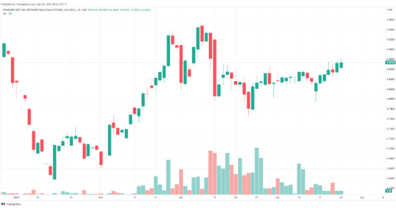 图:芝商所美元/离岸人民币期货(CNH)价格目前徘徊在接近6.9的水平(截至4月24日数据)