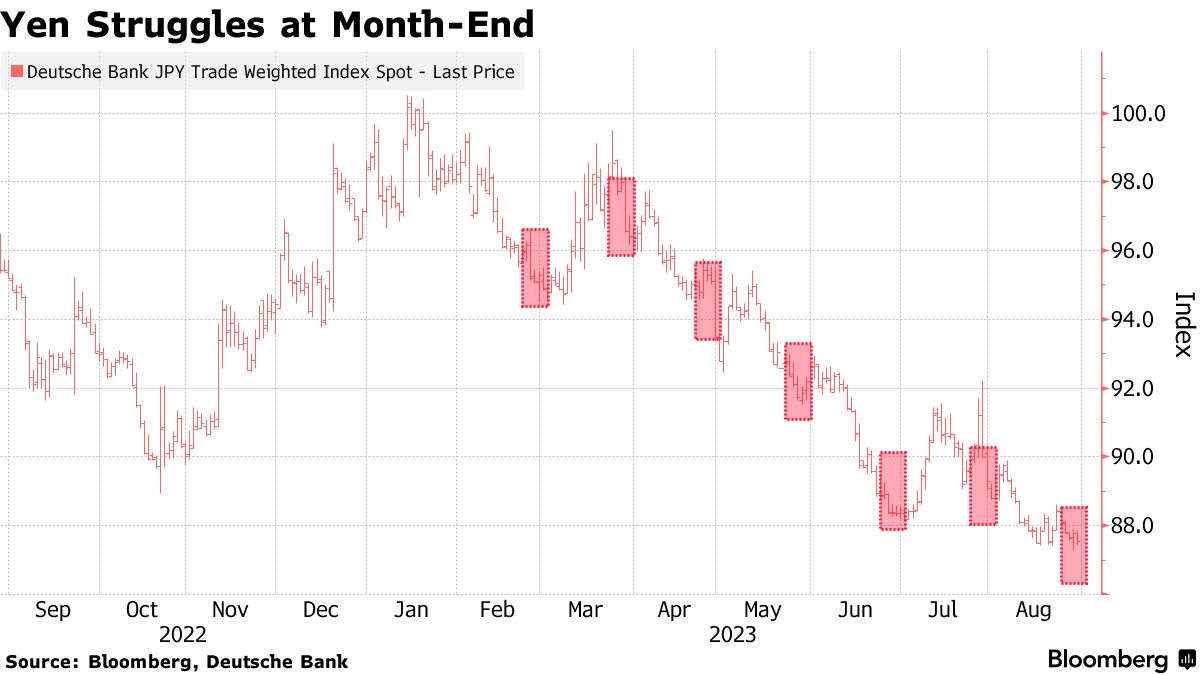 自今年2月以来,日元兑主要货币在每个月的最后几天都大幅下跌。随着8月接近尾声,日元再次面临压力。
