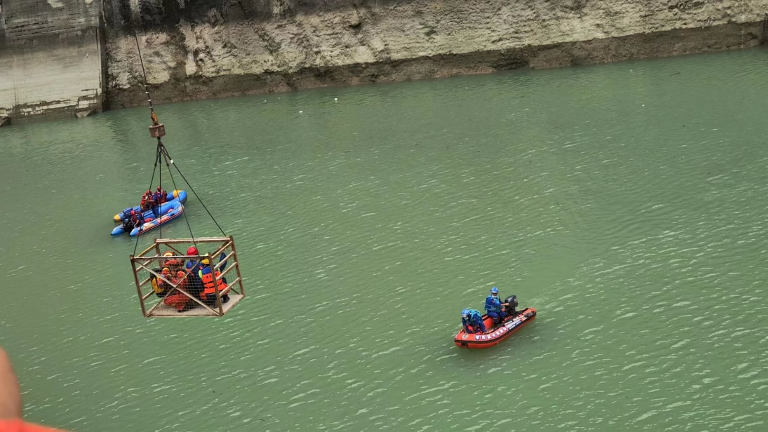 17点50分,通过塔吊成功将抢险设备和抢险队员从大坝吊运到库区冲锋艇。