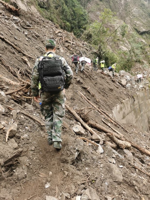 9月8日,根据石棉县抢险救灾指挥部安排,李攀峰携1套KA卫星便携站、1部天通电话,于12点59分前往草科乡。在道路严重受损的情况下, 在距离村庄7公里的地方,只能弃车徒步前进。一路上,李攀峰和抢险队员们一边关注滑坡、一边关注脚下,翻越了平时几乎不可能翻越的山。