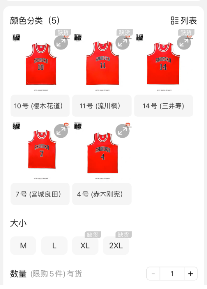 在湘北球衣中,10号樱木花道、11号流川枫、14号三井寿的球衣最受欢迎。此外,流川枫、三井寿的手办也出现了部分断货的现象。