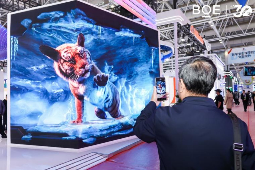在数字中国建设成果展现场,BOE(京东方)三大技术品牌旗下尖端科技产品纷纷亮相:展区外侧巨幅裸眼3D转角大屏上,一只色彩鲜艳的凤凰仿佛跃出屏幕迎面而来,吸引现场观众纷纷驻足观赏,该产品可实现百万级超高对比度的绚丽画面,配合裸眼3D显示画面效果极为惊艳。110英寸8K超高清裸眼3D大屏可实现1.5米出屏深度的超高清、超高色域3D立体纵深画面,同时采用独特的3D显示光学方案,解决了业内裸眼3D产品观看位置受限的技术难题,可满足多人、大范围移动观看,在游戏互动体验、大场景展览展示、商用显示等领域具有广阔的应用空间。